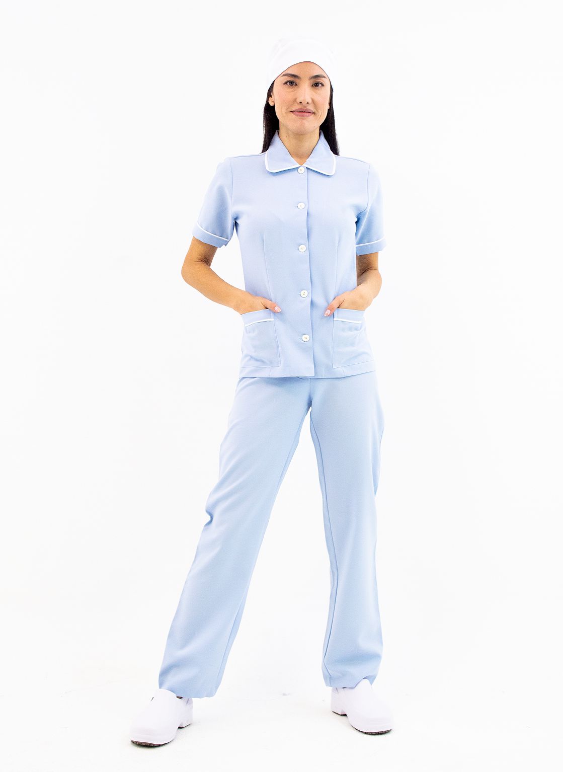 Conjunto de copa/faxina, sendo calça e jaleco com detalhes.